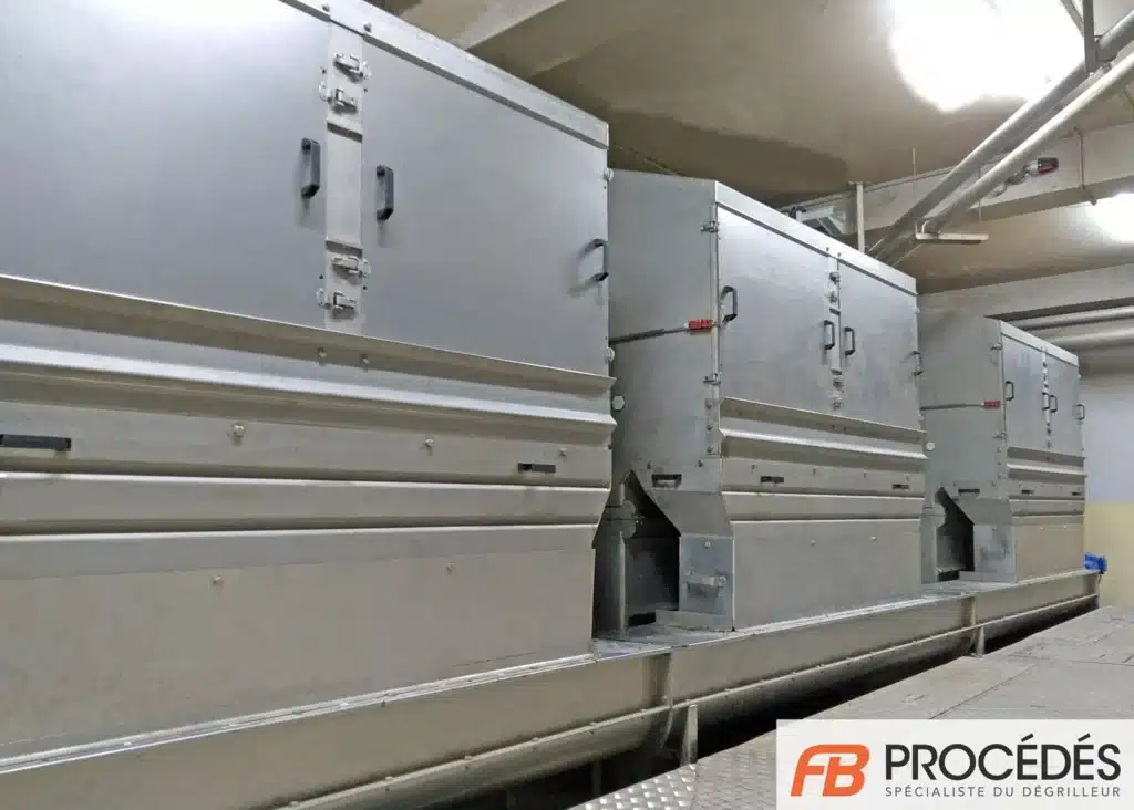 L’une des particularité de cette installation est la faible hauteur disponible dans le local, à savoir moins de 2800mm. Nous avons donc réalisé chaque dégrilleur en 3 parties.