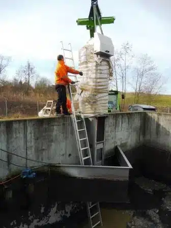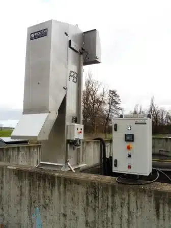 Plaqué contre une paroi verticale, et face à la conduite d’arrivée de l’effluent, ce dégrilleur récupère les déchets à deux mètres de profondeur et les déverse dans une poubelle positionnée à l’extérieur de l’ouvrage.