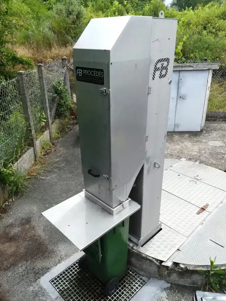 Aujourd’hui, sur le même poste, le dégrilleur est plaqué contre la paroi verticale, face à la conduite d’arrivée de l’effluent, et déverse les déchets dans une poubelle à l’extérieur du poste.