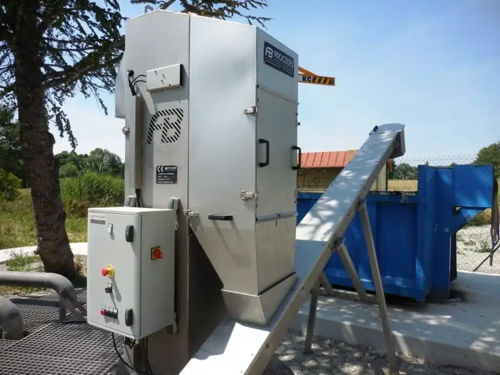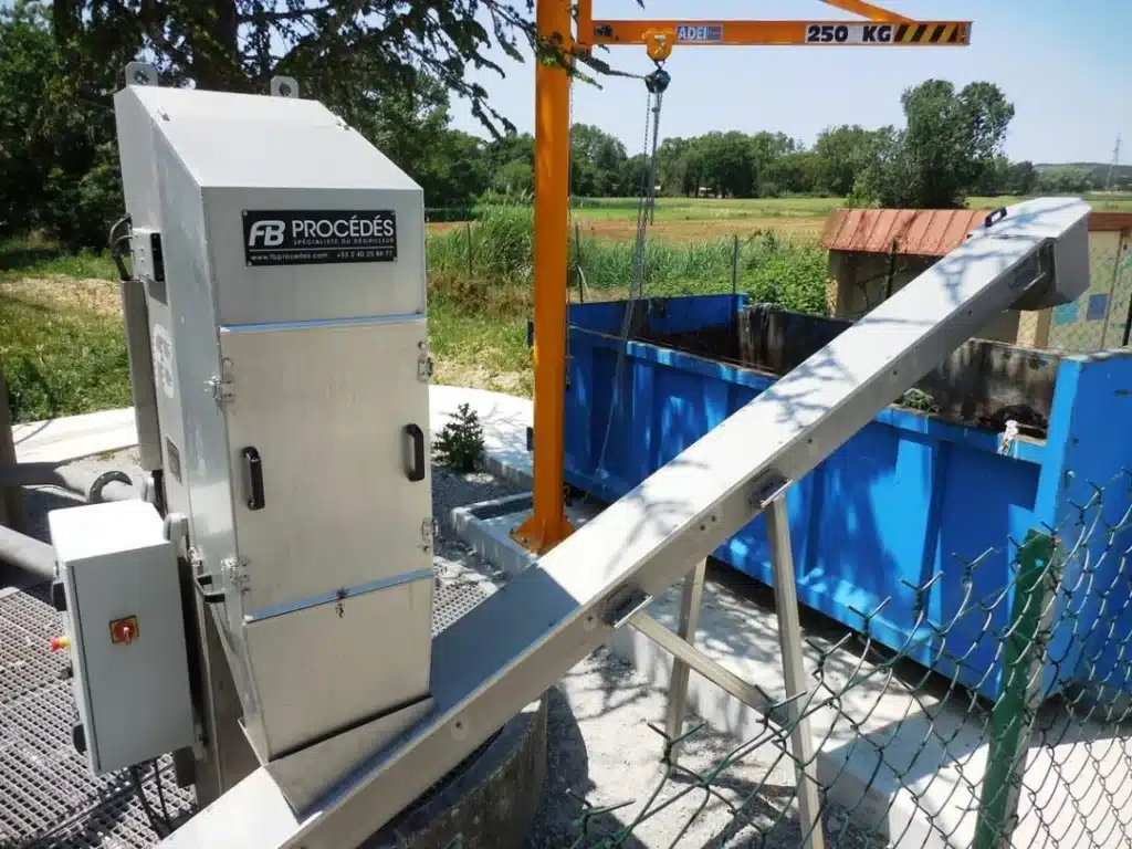 Les refus de dégrillage, via une vis de transport, sont déversés dans une benne placée à proximité.